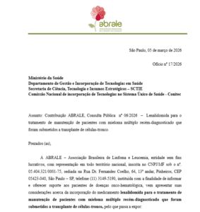 A Abrale defendeu que a lenalidomida é atualmente o padrão internacional para terapia de manutenção após transplante, com evidências de aumento da sobrevida e controle da doença. No Brasil, porém, o acesso ainda é limitado no sistema público, ampliando desigualdades em relação à saúde suplementar e a outros países.